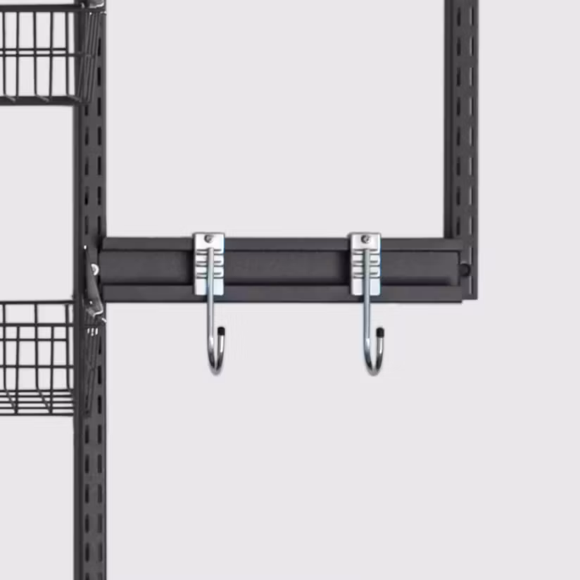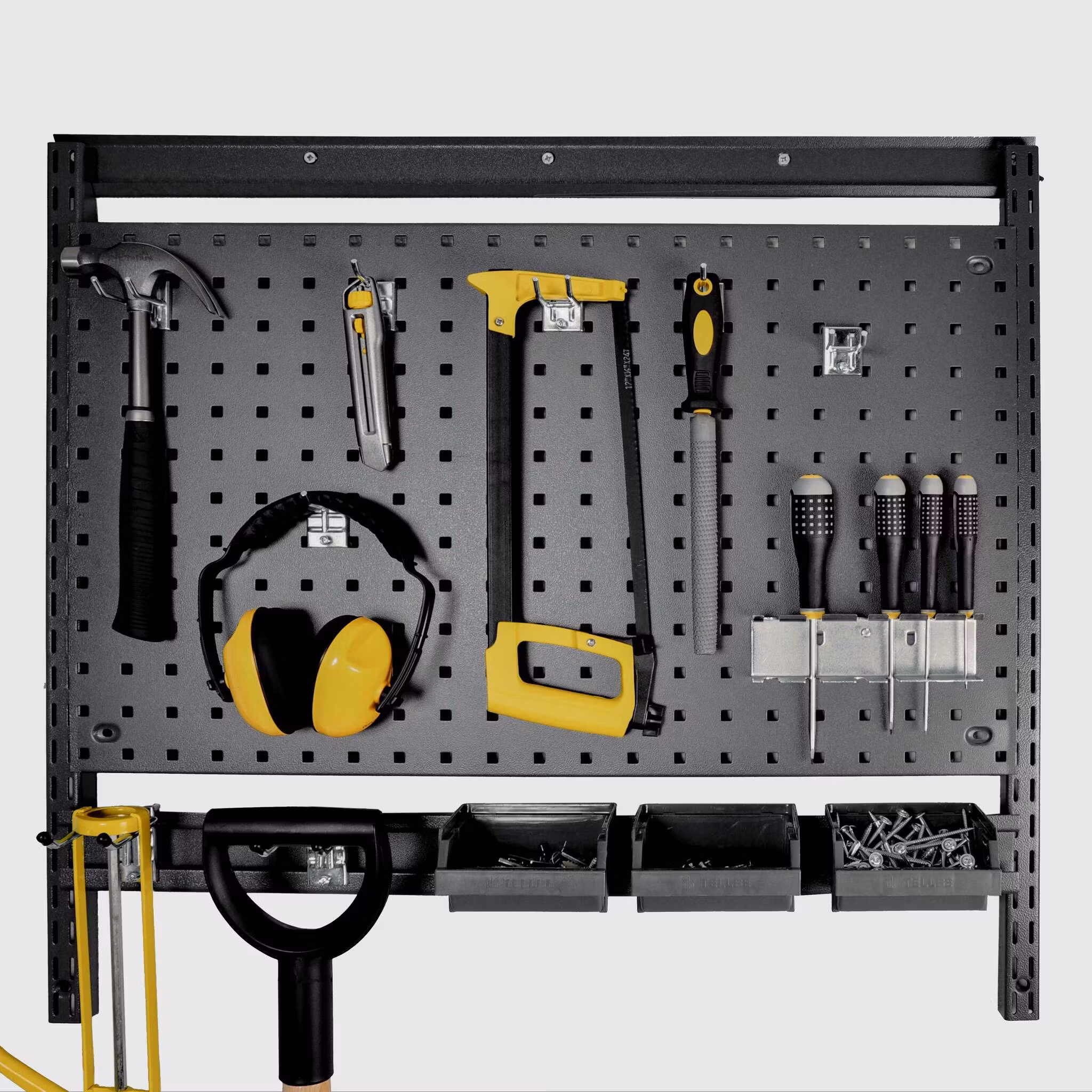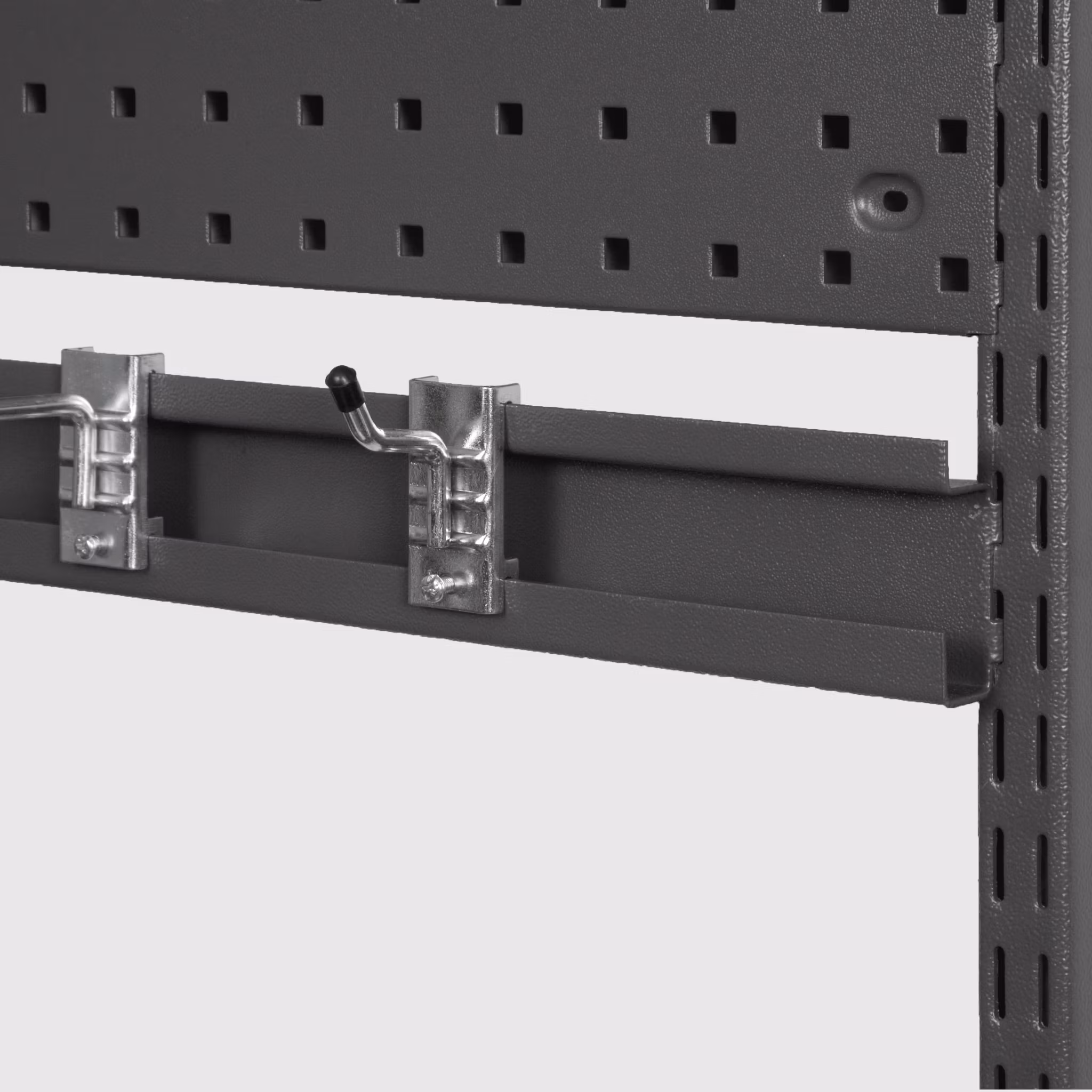 Kombinationsskenan utgör en flexibel bas för upphängning av plastbackar och förvaringskrok för dina redskap och verktyg.